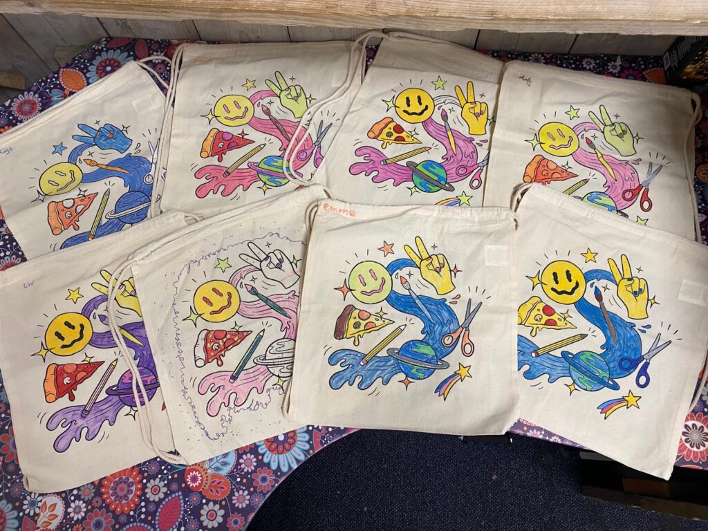 🛍️ Inkleuren van een mooie katoenen tas van het gekozen thema met fijne textielstiften.